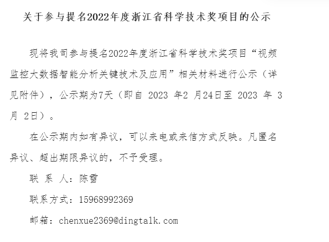 我司參與提名2022年寧波市科技進(jìn)步獎(jiǎng)項(xiàng)目《視頻監(jiān)控大數(shù)據(jù)智能分析關(guān)鍵技術(shù)及應(yīng)用》相關(guān)材料進(jìn)行公示